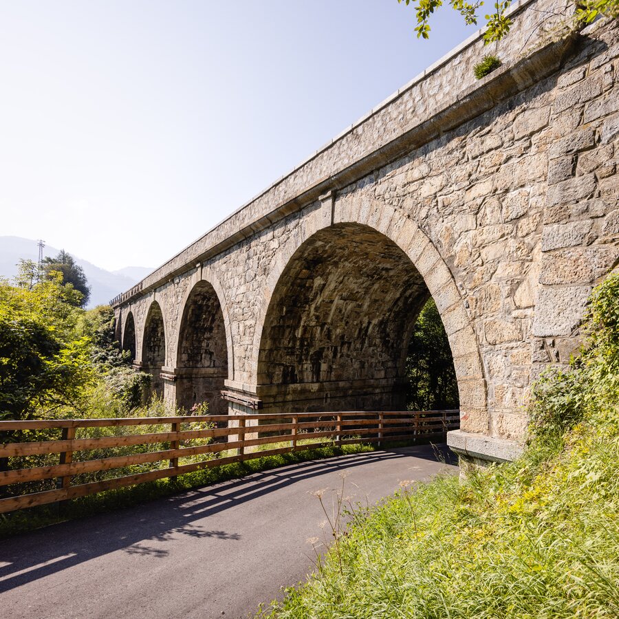 Il ponte storico del 1847 nell’area archeologica Windschnur, che mostra tre epoche della costruzione stradale e dei ponti in Val Pusteria.