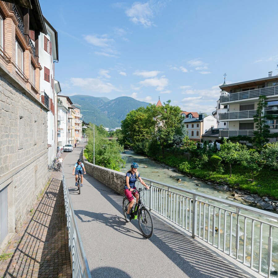 Hai voglia di fare un giro in bicicletta che sia tanto bello quanto rilassante? Allora ti consigliamo di imboccare una delle innumerevoli ciclabili che solcano il fondovalle e si inoltrano nel meraviglioso paesaggio naturale che circonda la città di Brunico. I molti percorsi, uno più bello dell'altro, tutti sostanzialmente in piano, sono perfetti per esplorare gli angoli più suggestivi della nostra area vacanze con la famiglia al seguito. Attraversano prati e campi, seguono gli argini della Rienza, si snodano da un paese all'altro, si addentrano nelle valli laterali e arrivano addirittura a sconfinare in Austria, spingendosi fino a Lienz. Un consiglio: meglio dare uno sguardo alla mappa prima di iniziare a pedalare.