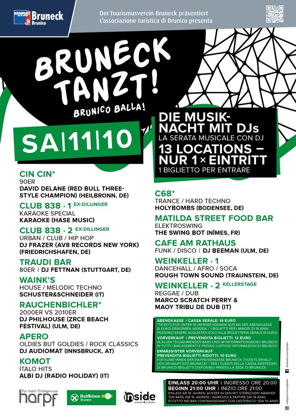DJ provenienti dall’Italia, dalla Germania, dalla Svizzera e dall’Austria trasformeranno Brunico in un’unica grande festa.