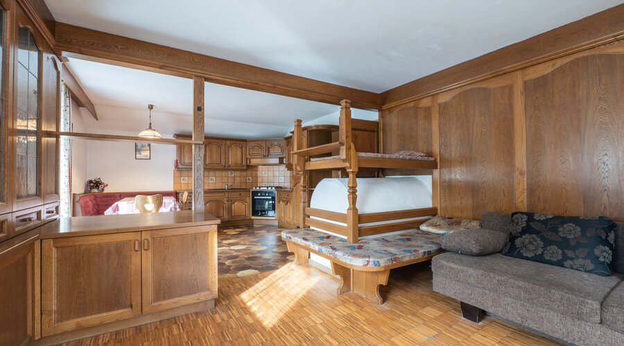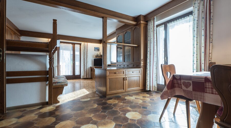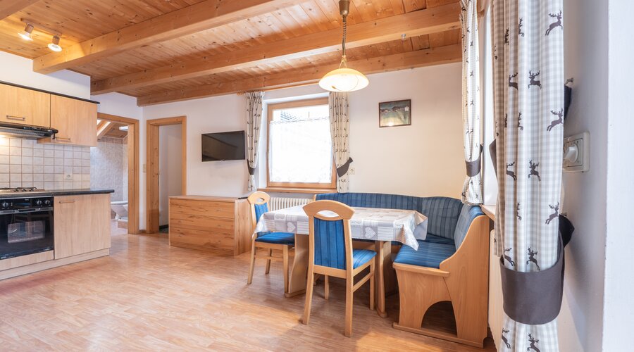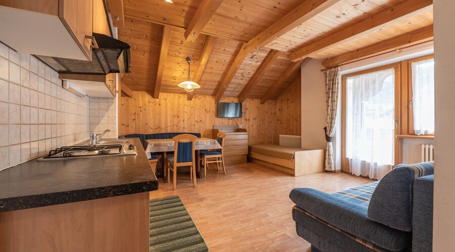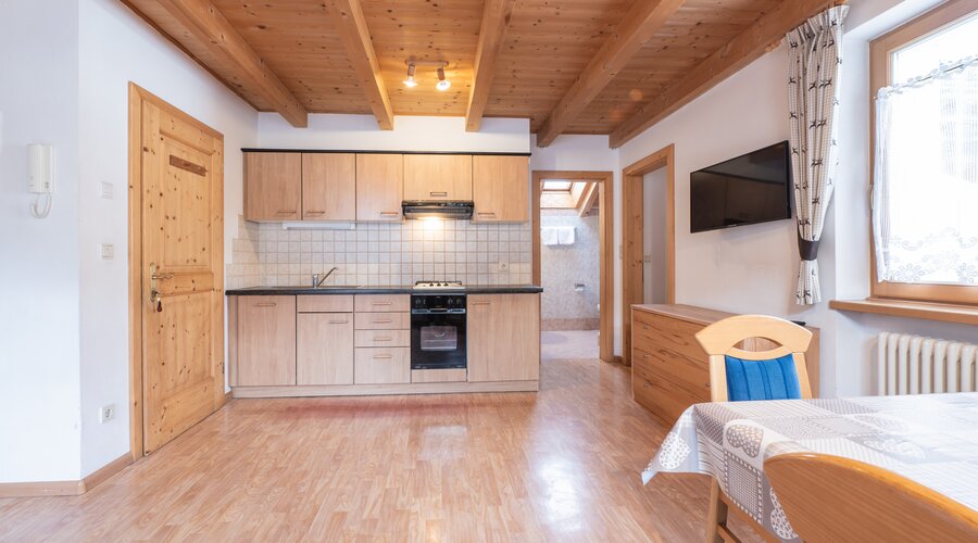 Apartment 4-6 bietet 80 m² stilvollen und komfortablen Wohnraum, ideal für 4-6 Personen. Es verfügt über zwei Doppelzimmer und zwei weitere Schlafplätze auf dem Schlafsofa im Wohnbereich, perfekt für Familien oder Freundesgruppen. Die voll ausgestattete Küche mit Geschirrspüler und allen modernen Annehmlichkeiten ermöglicht bequemes Kochen, während das Wohnzimmer mit TV zum Entspannen einlädt. Das Apartment verfügt außerdem über zwei Badezimmer und einen Balkon, um die atemberaubende Aussicht auf die Dolomiten zu genießen.