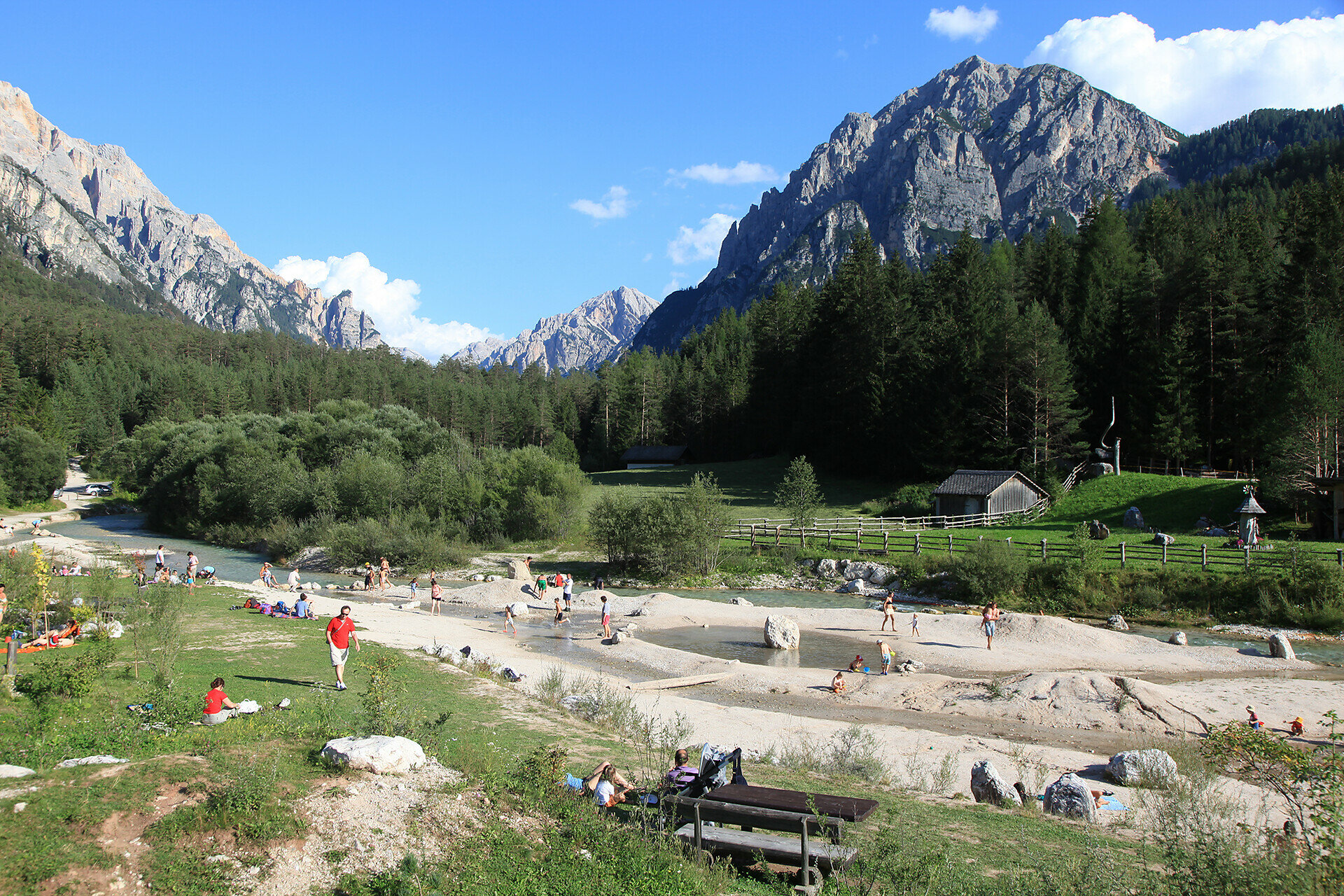 Am Besucherzentrum des Naturpark Fanes-Sennes-Prags (auch barrierefrei) dem Gehsteig richtung Pederü folgen. Am Sportplatz vorbei kommt man nach nur wenigen Minuten zum Strändchen Spiaggetta Ciamaor. Hier kann man verweilen und auf der Liegewiese gut entspannen.
