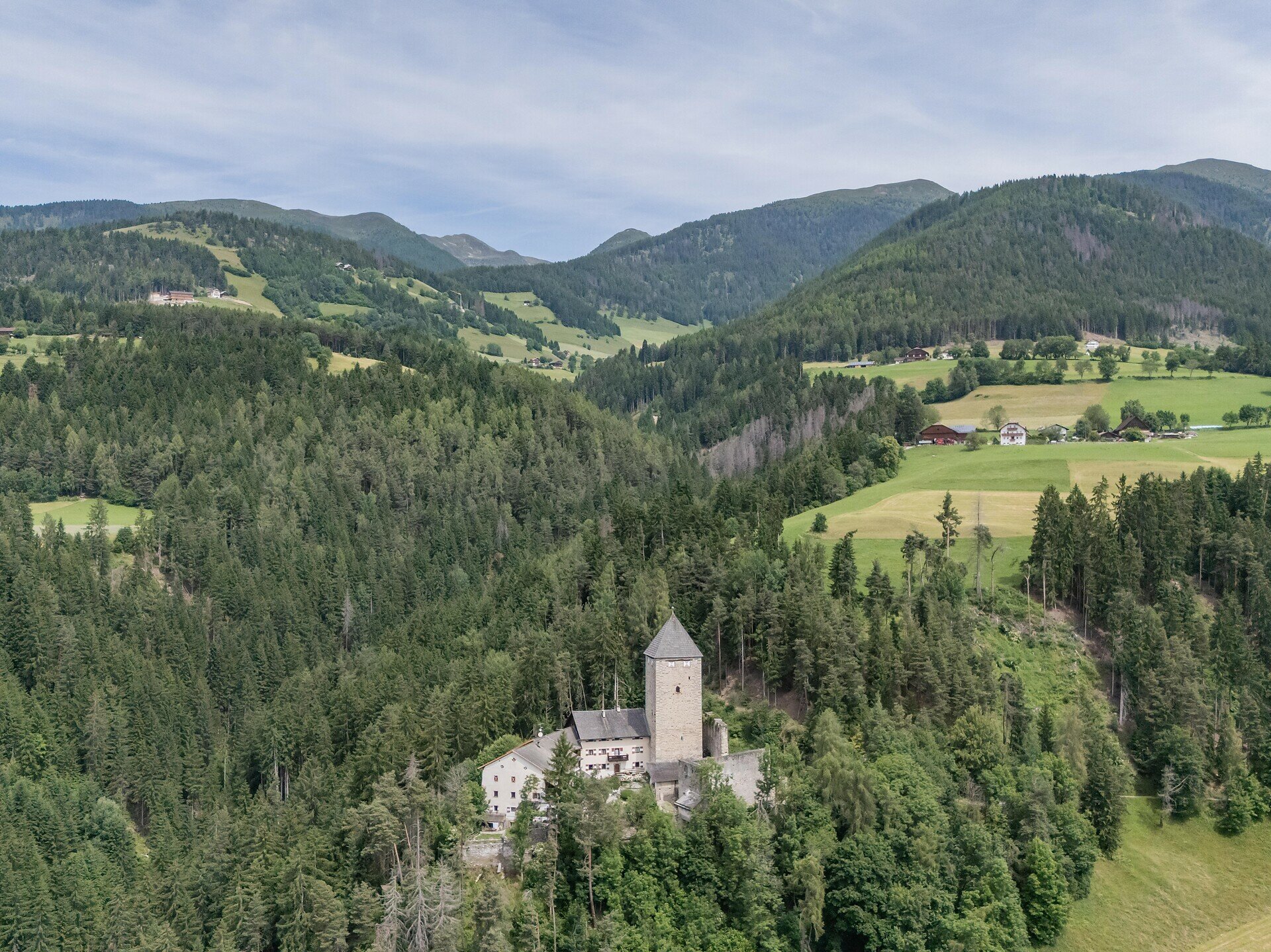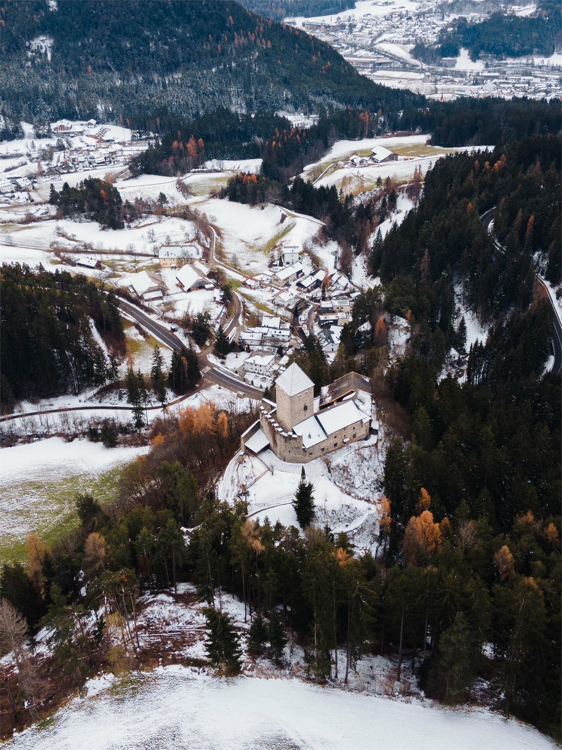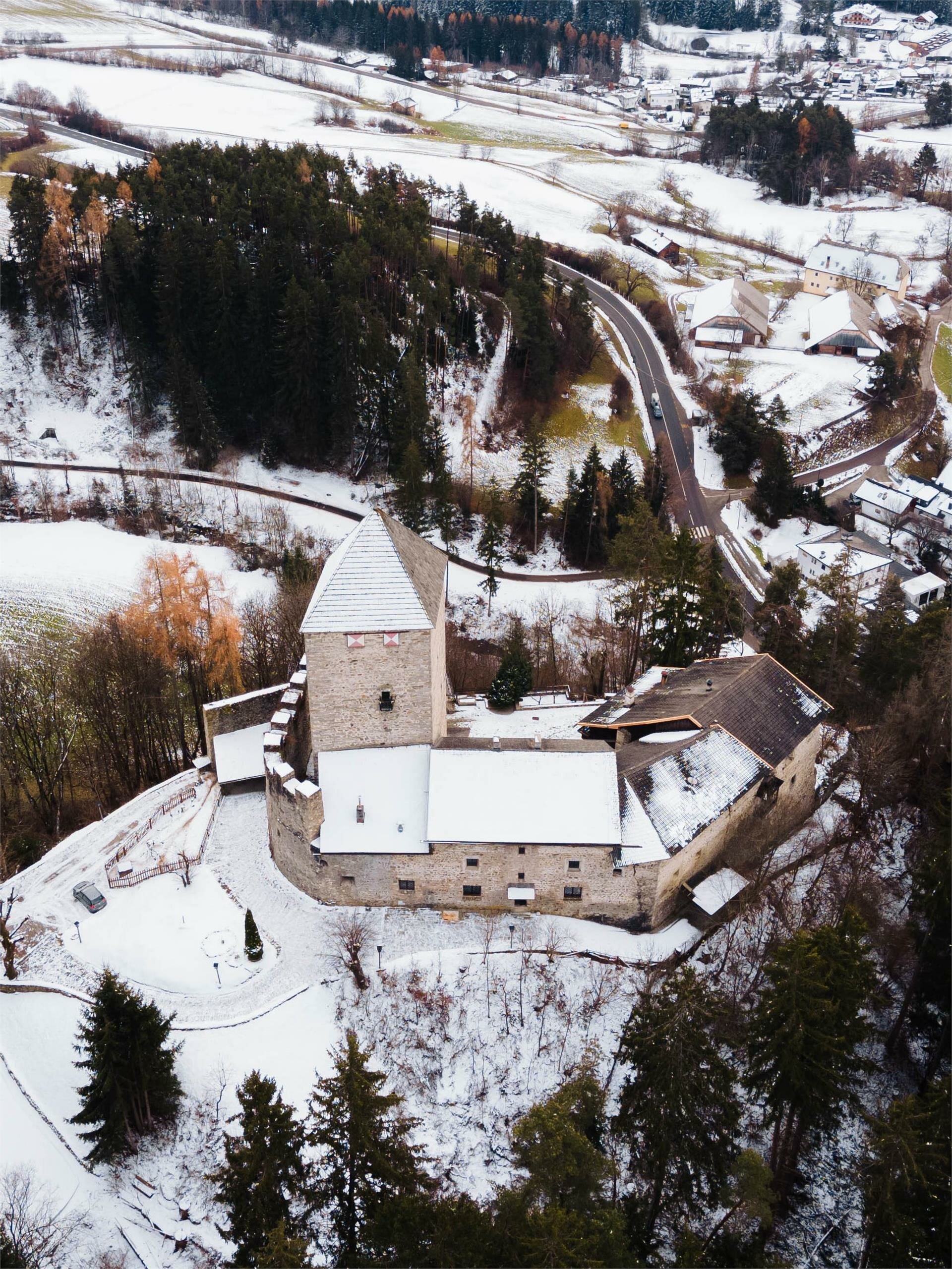 Il castello medievale di Schoneck si trova a 958 metri sopra il livello del mare e si dice che abbia dato i natali al famoso poeta e drammaturgo Oswald von Wolkenstein (1377-1445), anche se ciò non è stato storicamente dimostrato. Si ritiene che nelle vicinanze si trovino anche le rovine del Pacherhof, luogo di nascita del famoso artista e scultore Michael Pacher. Il castello di Schöneck fu costruito a metà del XIII secolo dai duchi di Rödeneck; La prima menzione di questo complesso risale al 1155 e al 1164.