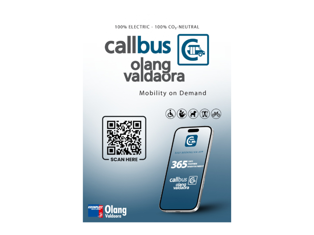 Il CallBus è un servizio flessibile “on-demand” a trazione elettrica a Valdaora, con oltre 90 fermate. La prenotazione avviene comodamente tramite app e il servizio integra l’offerta di mobilità esistente al di fuori degli orari fissi. È accessibile senza barriere, trasporta biciclette in estate e attrezzatura da sci in inverno e, su richiesta, mette a disposizione seggiolini per bambini e box per cani. Per i possessori del Guest Pass Plan de Corones o di un altoadigemobilitá Pass il servizio è gratuito, mentre tutti gli altri pagano 2 € a corsa.
