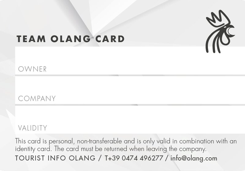 Non appena finisci il tuo lavoro in una delle aziende membri dell'Associazione Turistica di Valdaora, entrerai a far parte del nostro team e riceverai la tua personale Olang Card! Oltre a un ottimo lavoro, avrai anche accesso a molti programmi per il tempo libero, sconti, opportunità di formazione e molto altro.